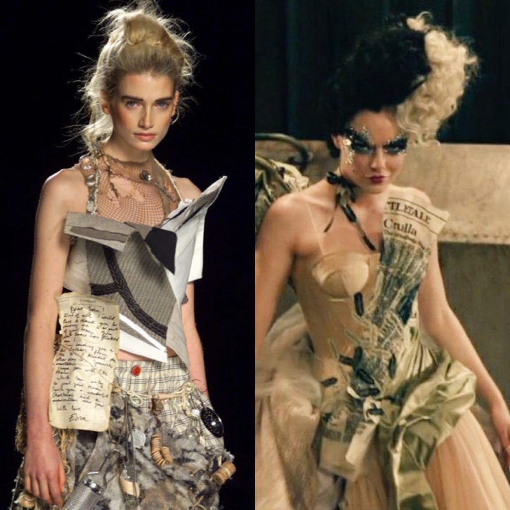 Но не все наряды Круэллы были вдохновлены Вивьен Вествуд. Например, сцена появление Круэллы, где та изящно «вывалилась» из мусоровоза. На героине было длинное платье из молочной тафты, которое было сшито из множества других нарядов и газет. Стиль этого наряда очень схож с работами дизайнера одежды Гальяно для Диора.